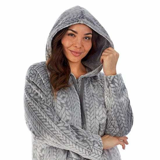 Featuring a cozy plush fabric with faux suede and cable-pattern embossed accents, this women’s Koolaburra by UGG short zipper robe with a Kangaroo pocket abounds with luxurious style.